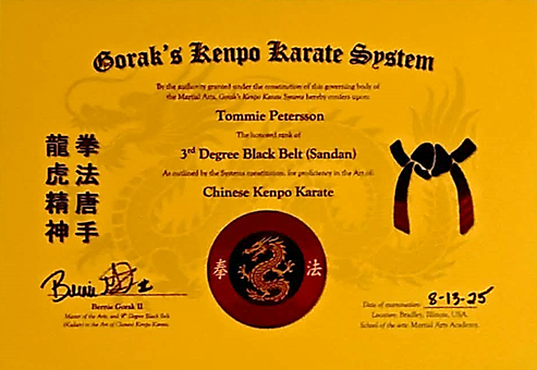 Below are some of the most recent black belt certificates of our Head Instructor, Sensei Tommie Rappe Petersson, in Kenpo Karate and Jiu-Jitsu.