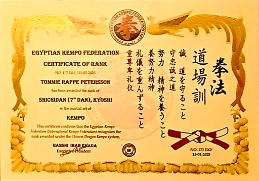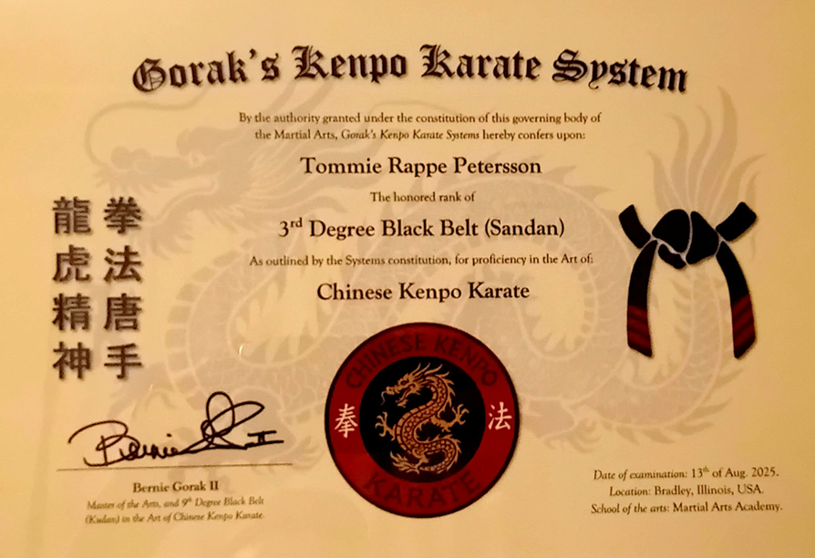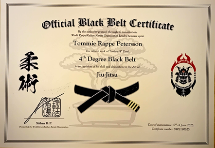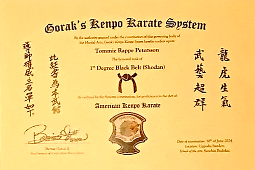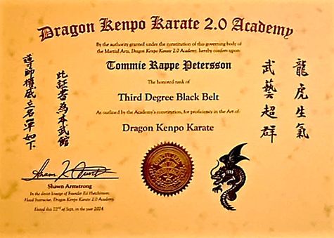 Nedan återfinns några av vår huvudinstruktör, Sensei Tommie Rappe Peterssons, senaste svartbältesdiplom i Kenpo Karate och Jiu-Jitsu.